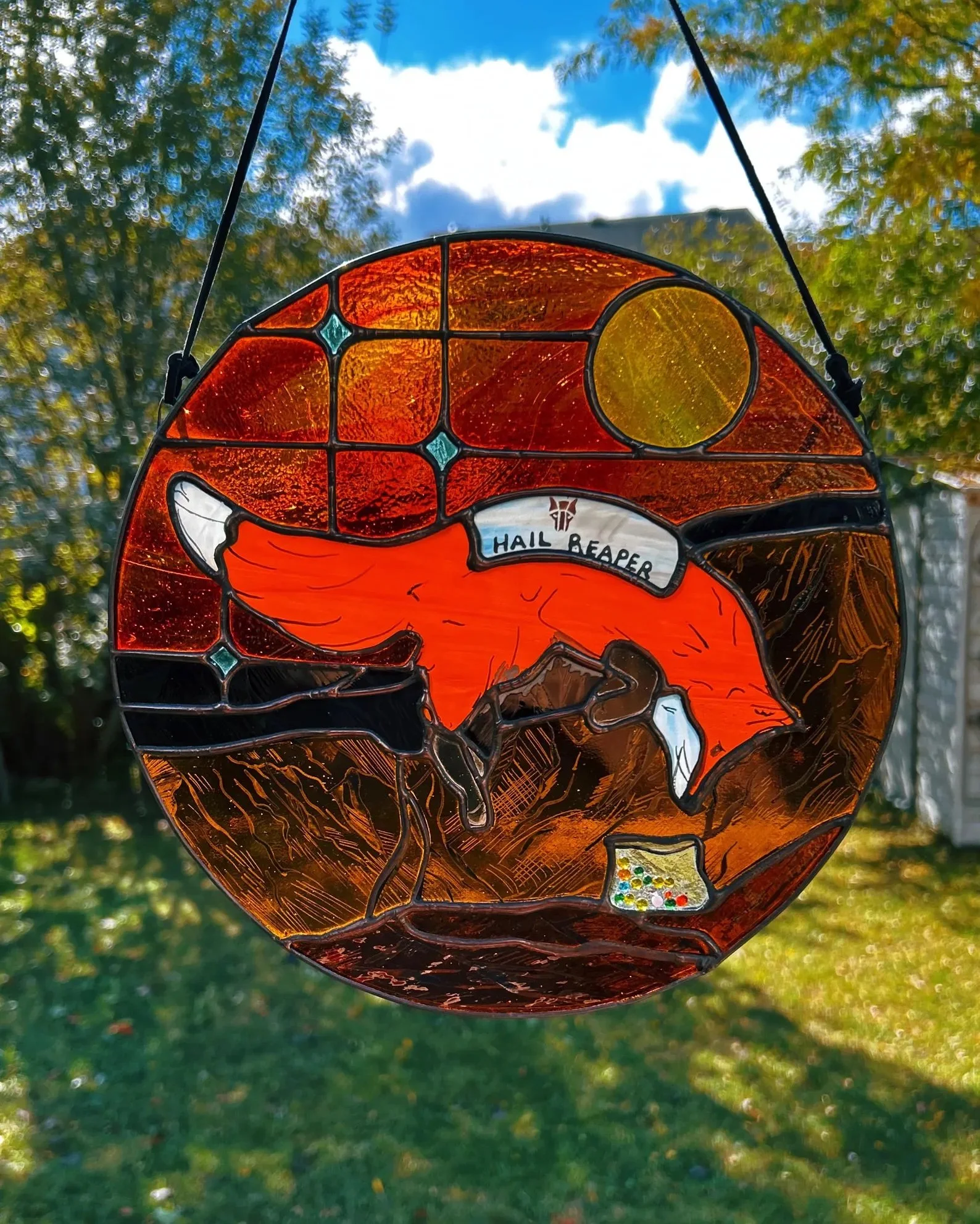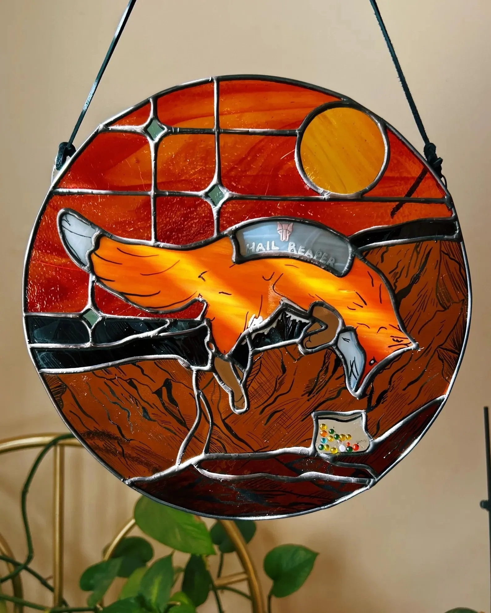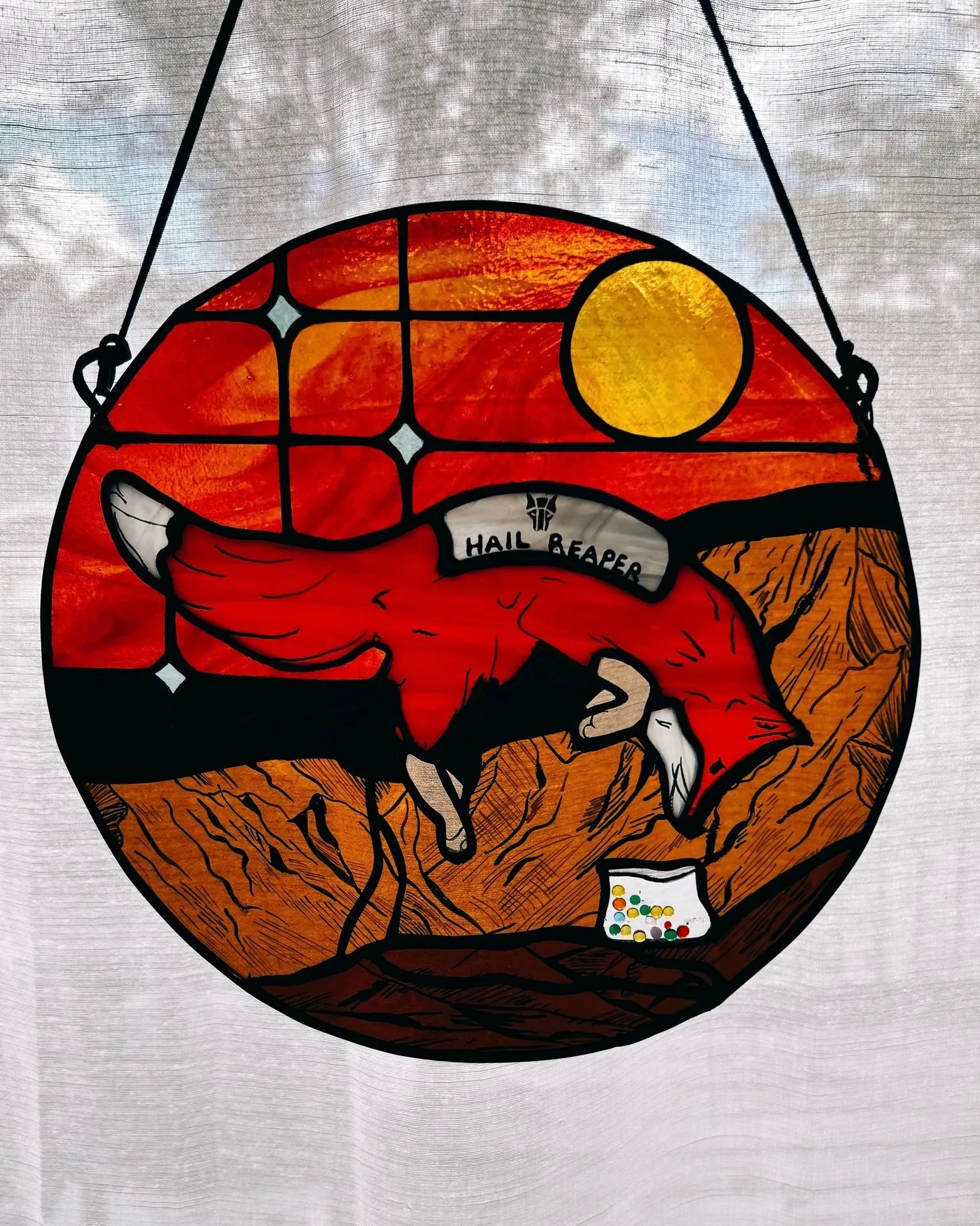 Bring a touch of the Red Rising Saga to your collection with this one of a kind, handcrafted stained glass Sophocles suncatcher. Complete with his signature bag of jellybeans, this charming fox is a must-have for any fan of the Red Rising universe. Measuring 10 inches long, he’s the perfect blend of art, fandom, and whimsy. This piece was created with hand painted detailing, and fused glass techniques.